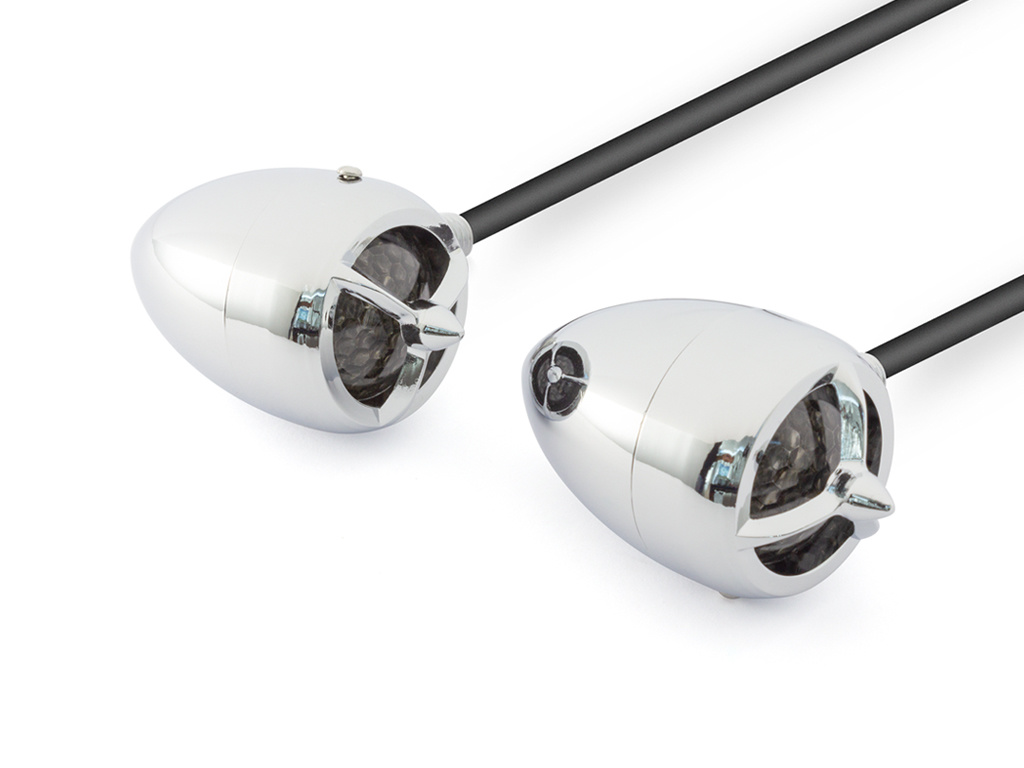 Diese hochwertigen Blinker haben eine klassische Form mit modernen LEDs. Das Gehäuse besteht aus einer Zinkgusslegierung mit einer tiefen Chromoberfläche. Die Blinker passen auf mehrere Custom-Bikes, Harley Davidsons, Chopper usw.
