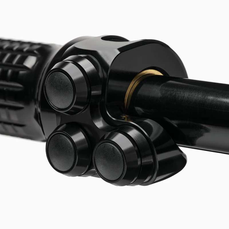 Die zwei bzw. drei Taster pro Einheit sind stets schwarz. Eine versteckte M4-Befestigungsschraube aus Edelstahl klemmt das Gehäuse sicher und stabil an jedem Lenker.