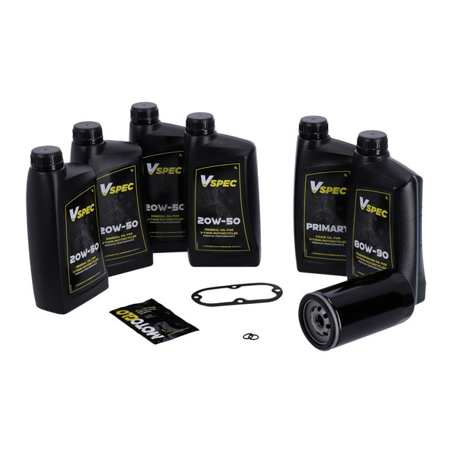 MCS Big SAE 20W50 Mineral Engine Oil Service Kit includes quality Mineral SAE 20W50 multi-grade Vspec Engine Oil for classic engines that require mineral engine oil. It meets or exceeds JASO MA/2. It is used to service your bike during a normal maintenance interval or before you store it for the winter season.