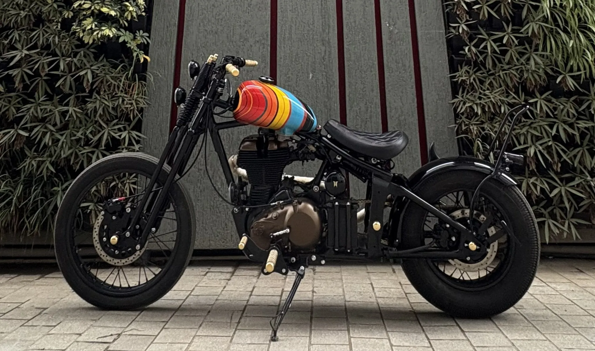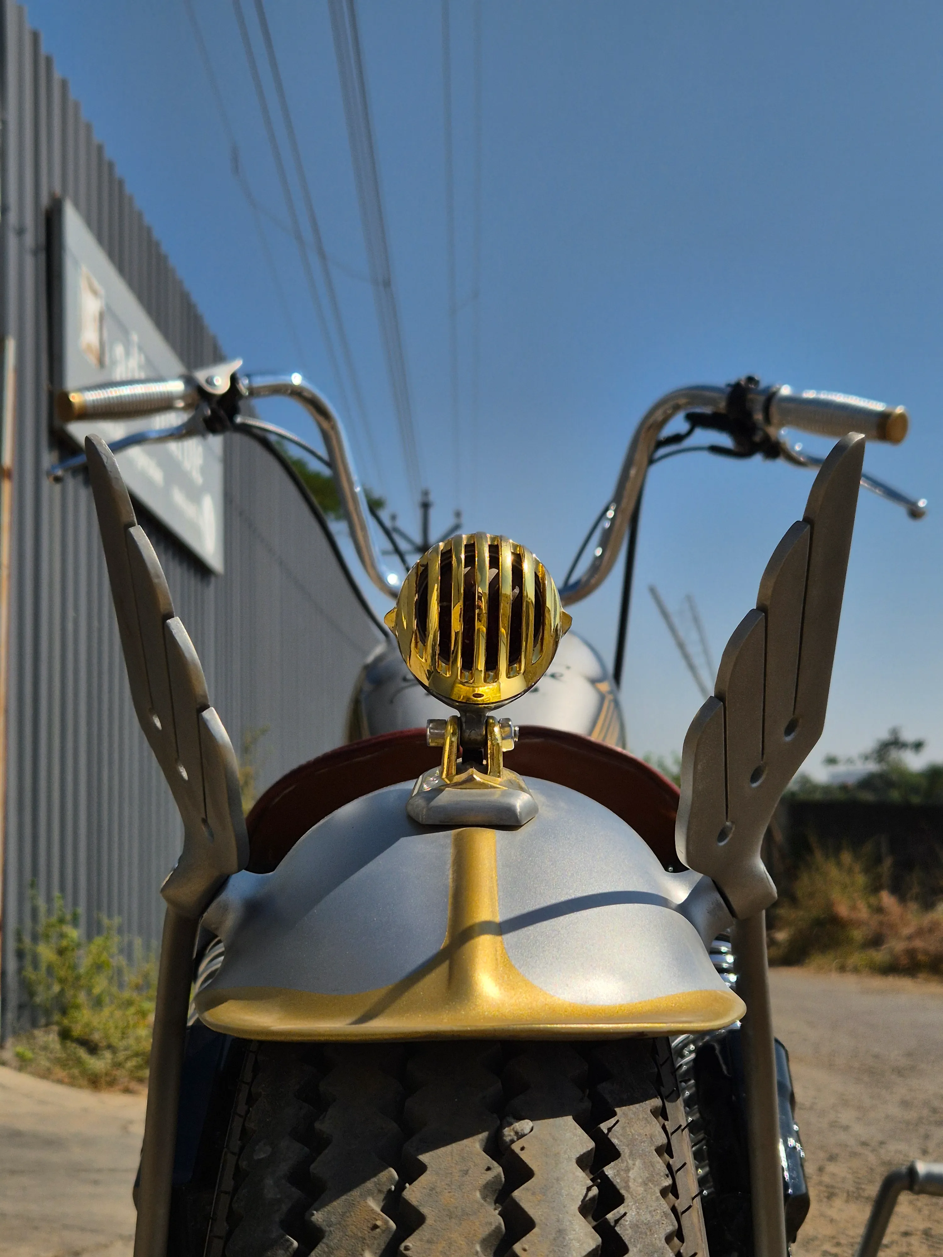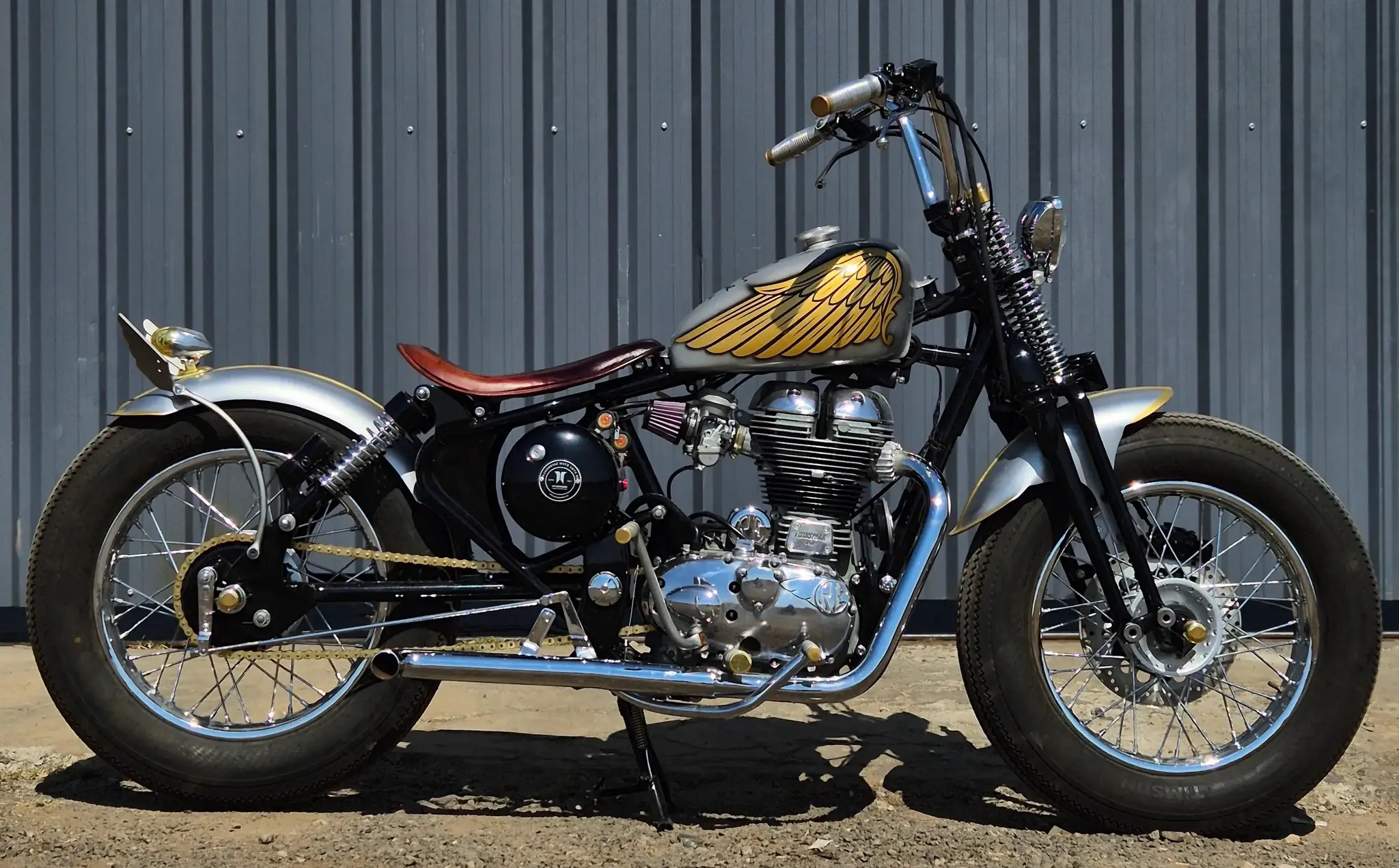 The tank truly ties the entire bike together. The sculpted balloon-style bobber tank is painted in deep gloss black, mirror chrome and silver accents, highlighted with regal gold detailing. The hand-painted golden wings on the tank add character and symbolise motion, freedom and old-school rebellion.