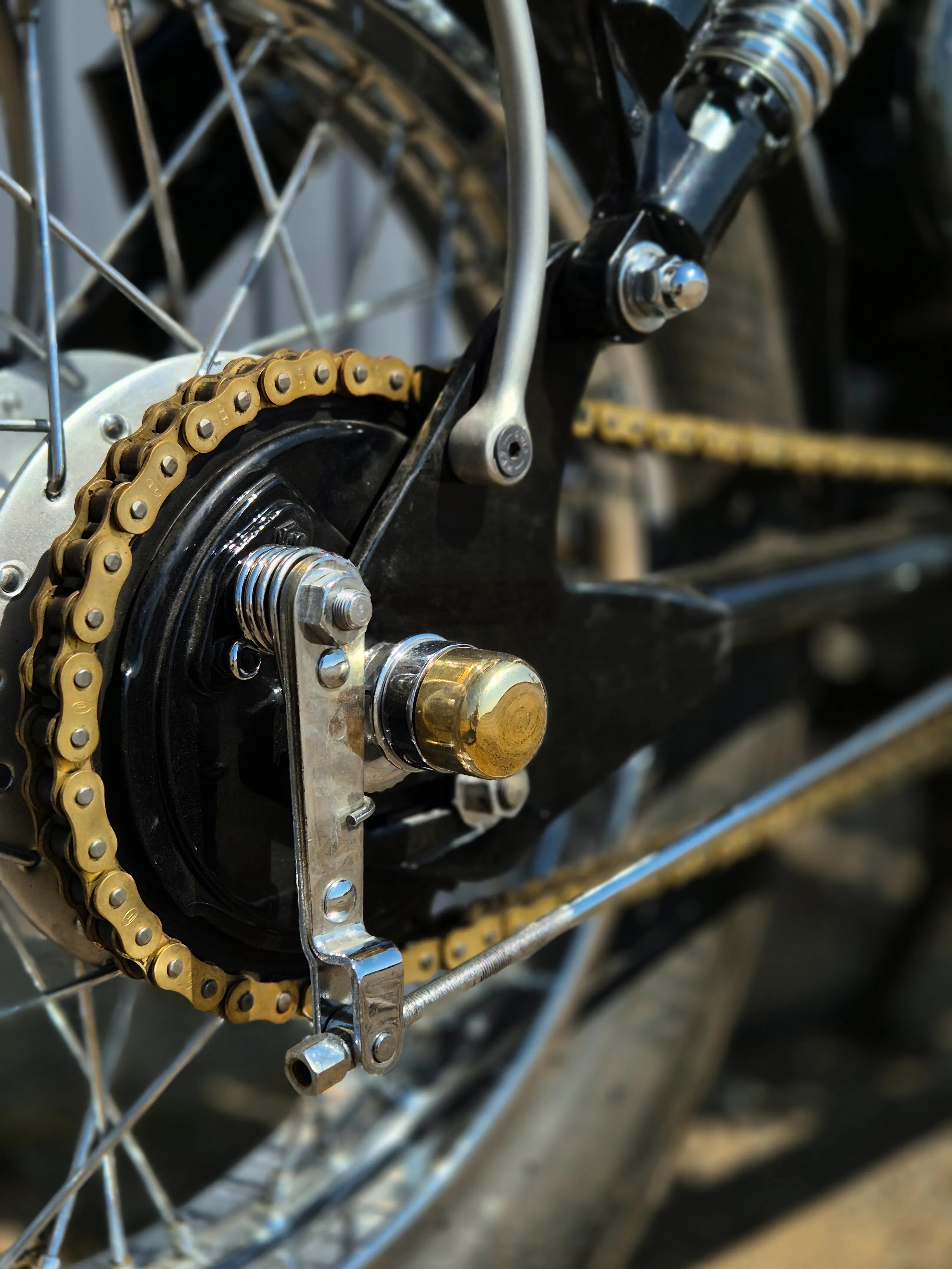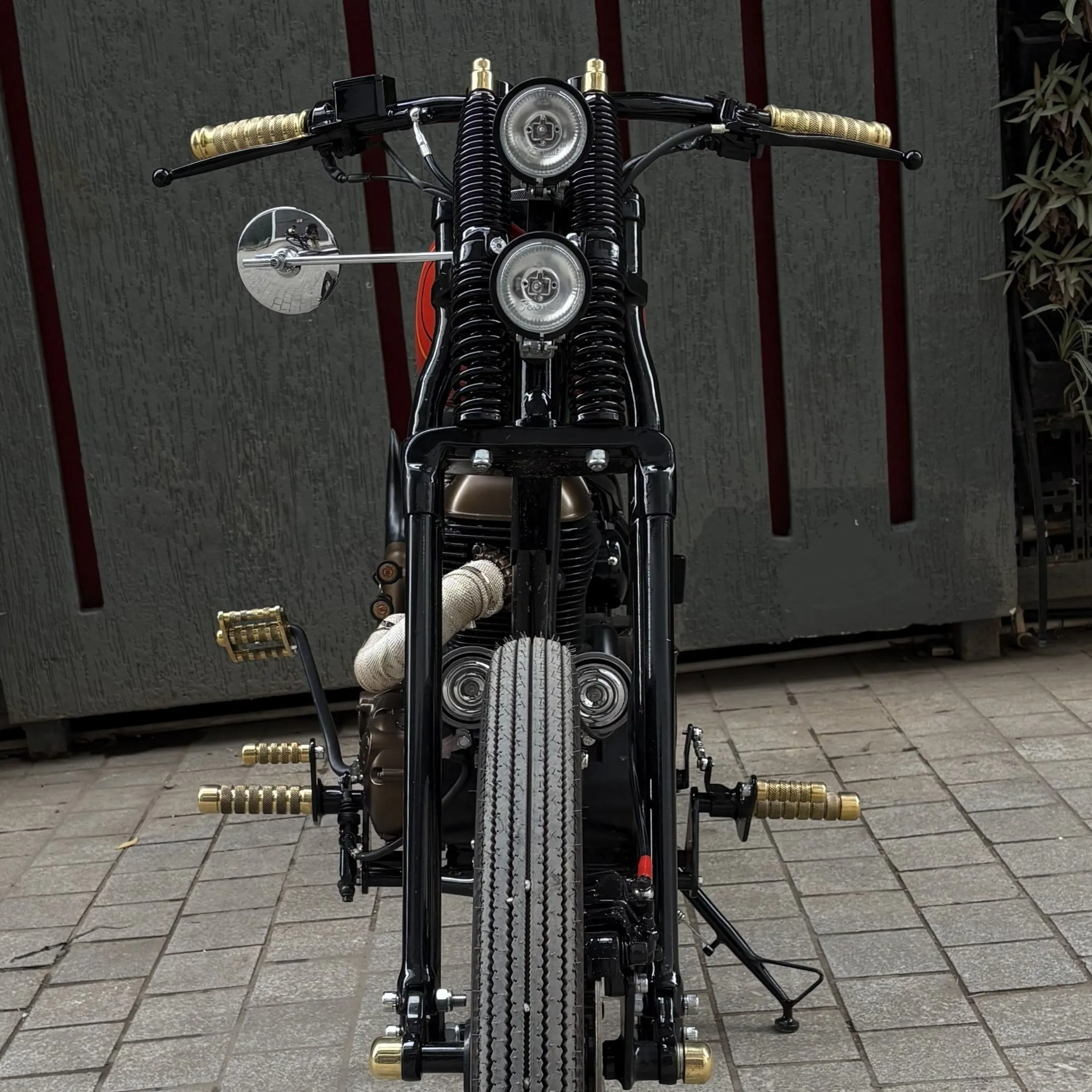 - Custom knurled foot pegs and grips with warm brass accents