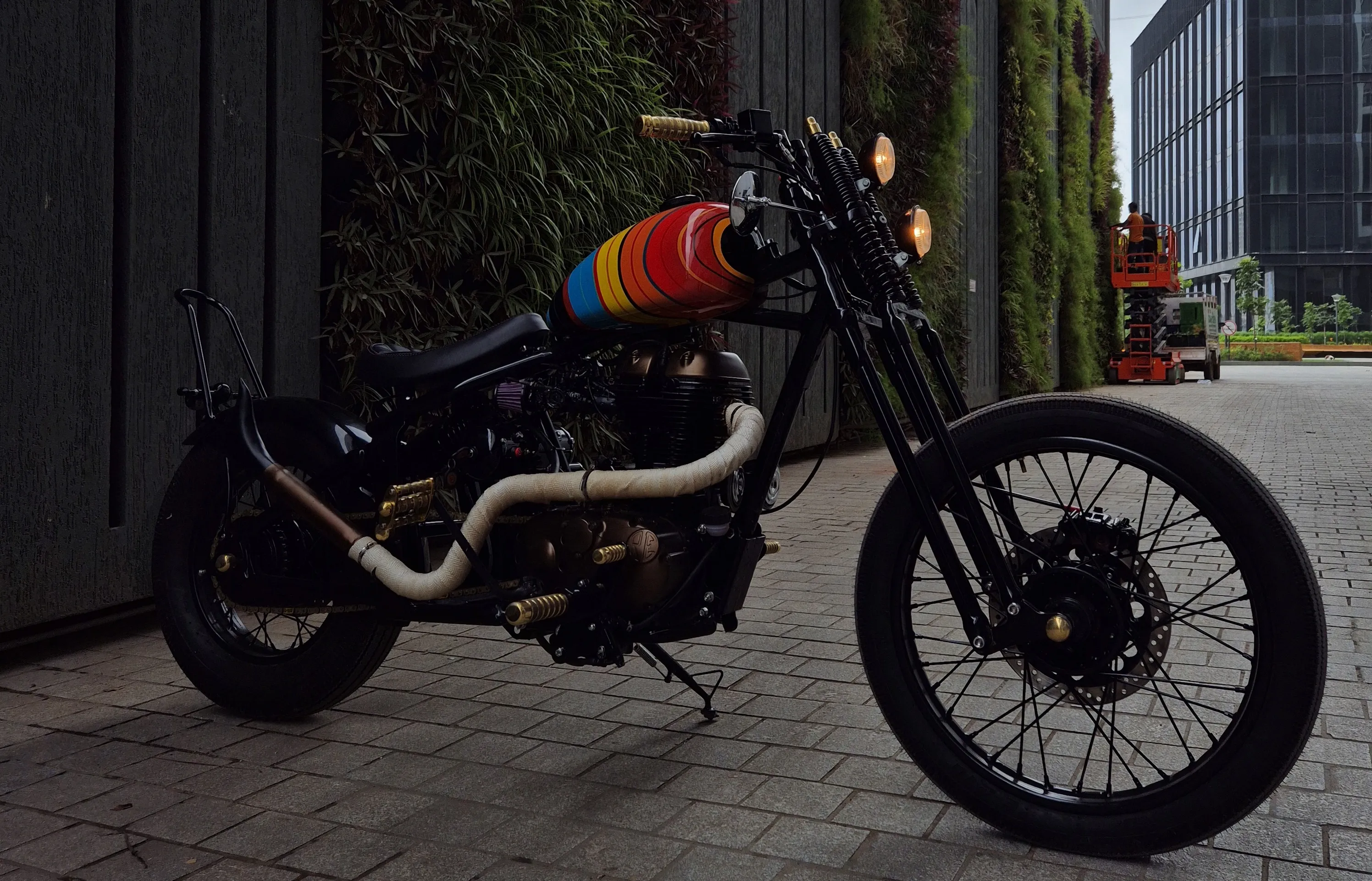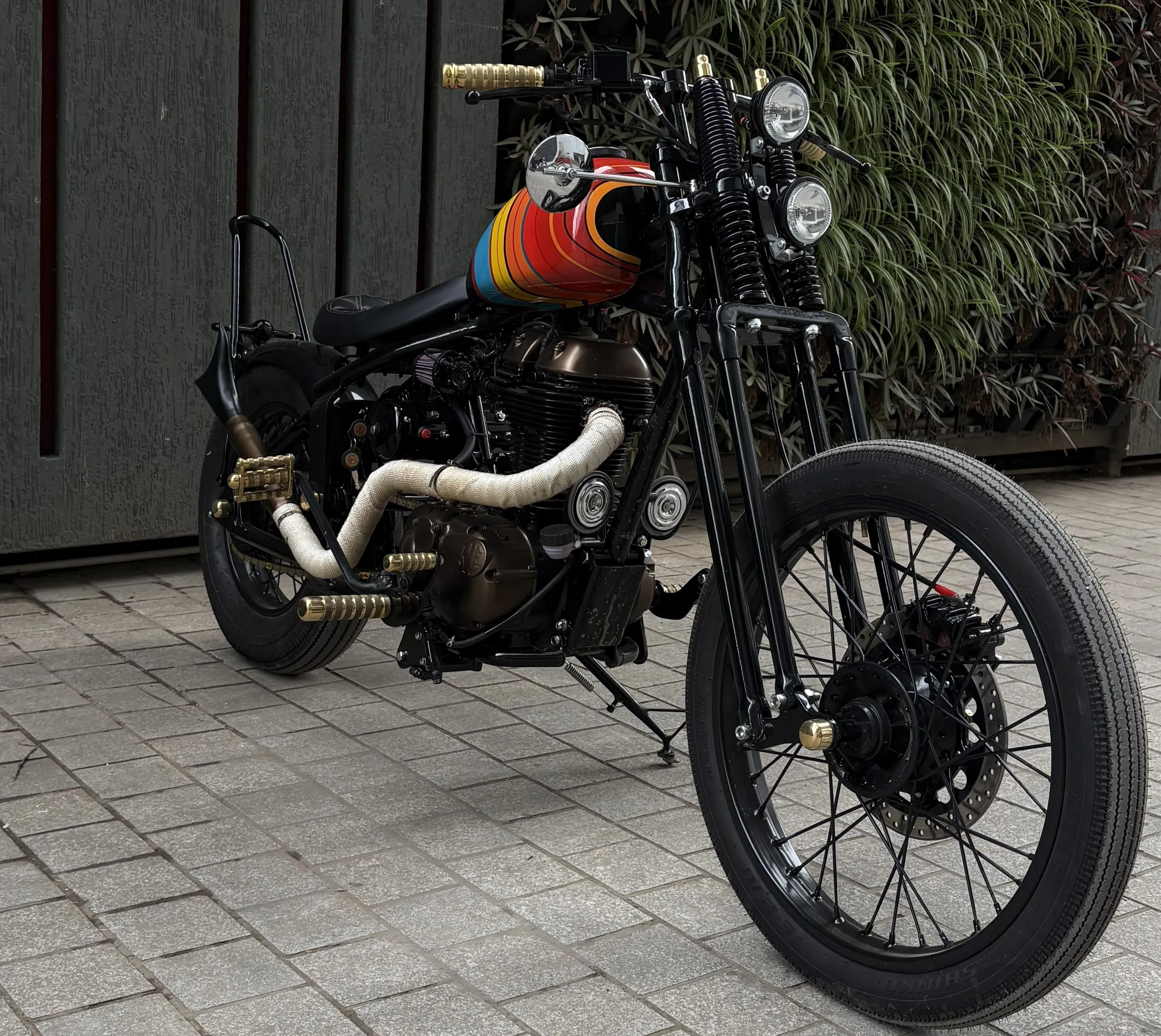 At the front of the bike, the springer fork offers the raw, mechanical feel you would expect from an old-school build. With tall ape-style handlebars, the riding position is strong and confident. This setup helps to make cruising feel more natural.