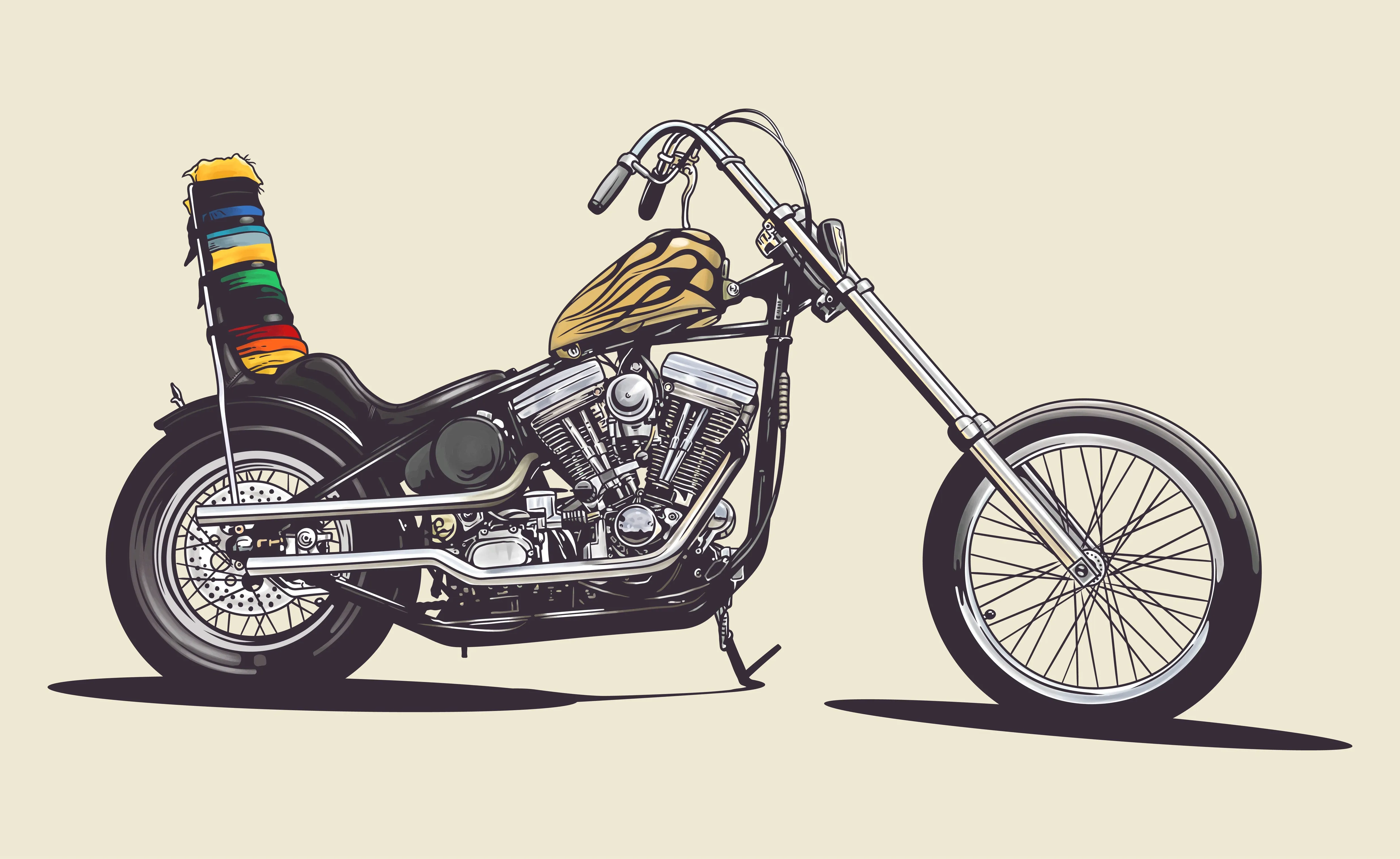 This represents the model. Long hydraulic forks or springers, hardtail frames, skinny front wheels, tall sissy bars, and peanut tanks. The motorcycles looked stretched out skeletal and raw. This is what most people picture when they hear the word "chopper."