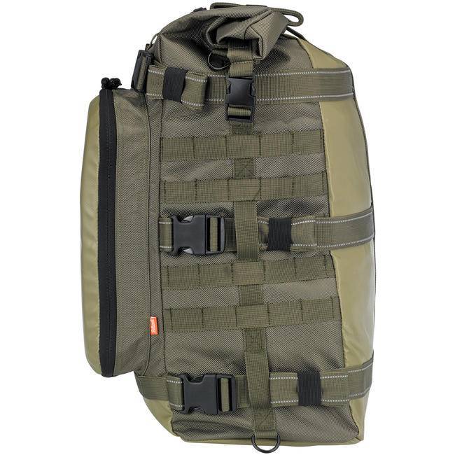 Built to hold all your gear, this robust moto-ruck will easily swallow everything you need to travel and camp from your motorcycle for days on end. Adding functionality, the large external tool compartment is padded on the outside so you can lean back on it. This section easily unzips to put your tools and smaller items right at your fingertips without unstrapping the bag from your bike. The EXFIL-80 UV-treated and water resistant, but when you need 100% waterproofing, just open the zipper just under the tool compartment and pull out the attached waterproof sleeve and slide it over the entire system.
