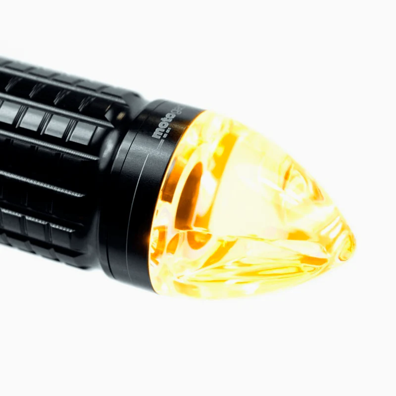 Traditionally, the casing is machined from solid aluminium, anodized black or high gloss polished and furnished with an elegant finish of laser inscriptions. With its transparent glass body, the mo.blaze cone presents a very neutral and subtle look. That's why the mo.blaze is the perfect match to many styles and all types of motorbikes.