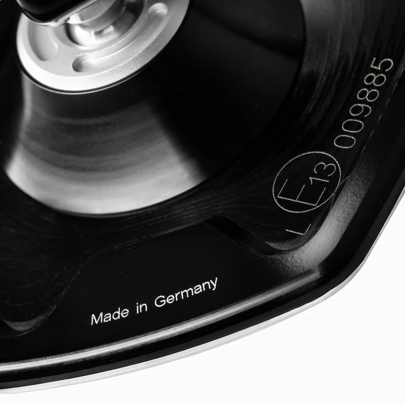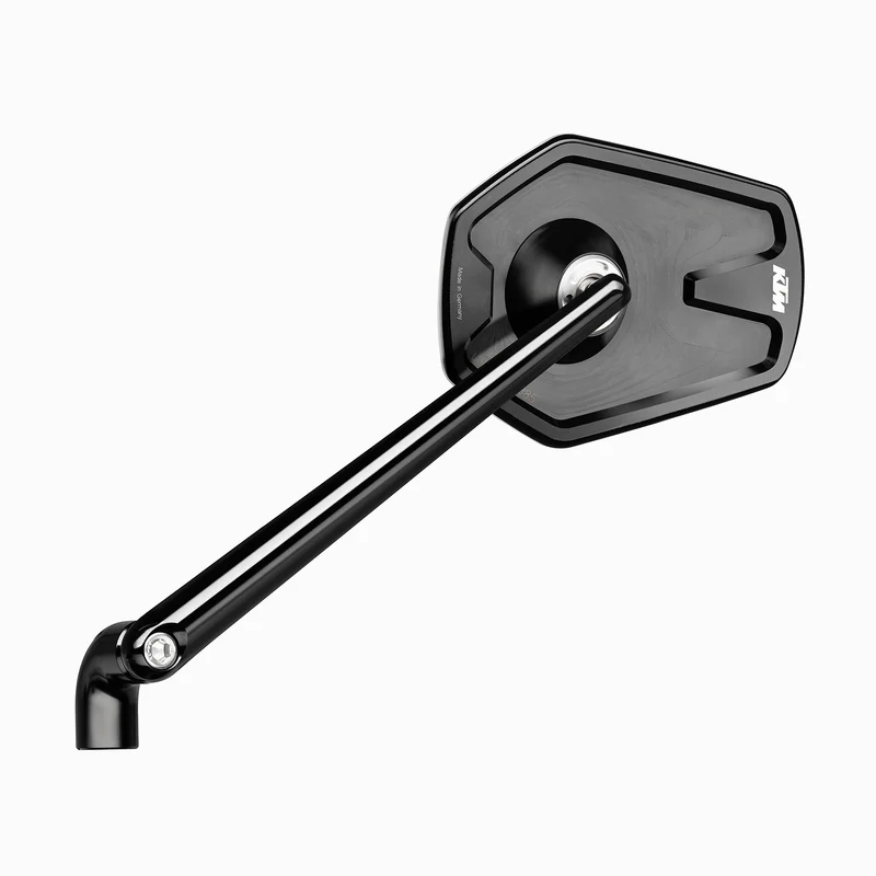 The mirror body and mirror arm are milled from solid aluminium on CNC machines and anodized to a high quality. All screws are made of stainless steel. The precise ball joint allows the mirror to be adjusted comfortably and very stably. Glass breakage or glass falling out is simply not possible.