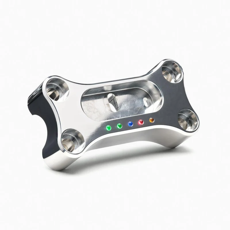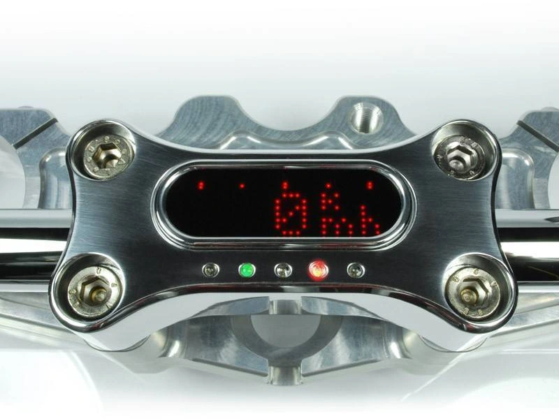 The motoscope mini metric handle bar top clamp Polished 22 mm with indicator lights allows the Motoscope Mini to be mounted on the triple clamps of superbikes with a hole spacing of 33 mm x 85 mm. This is the case with most Superbike triple clamps of LSL, ABM, Rairotec, Lucas, MFW, Spiegler, etc.