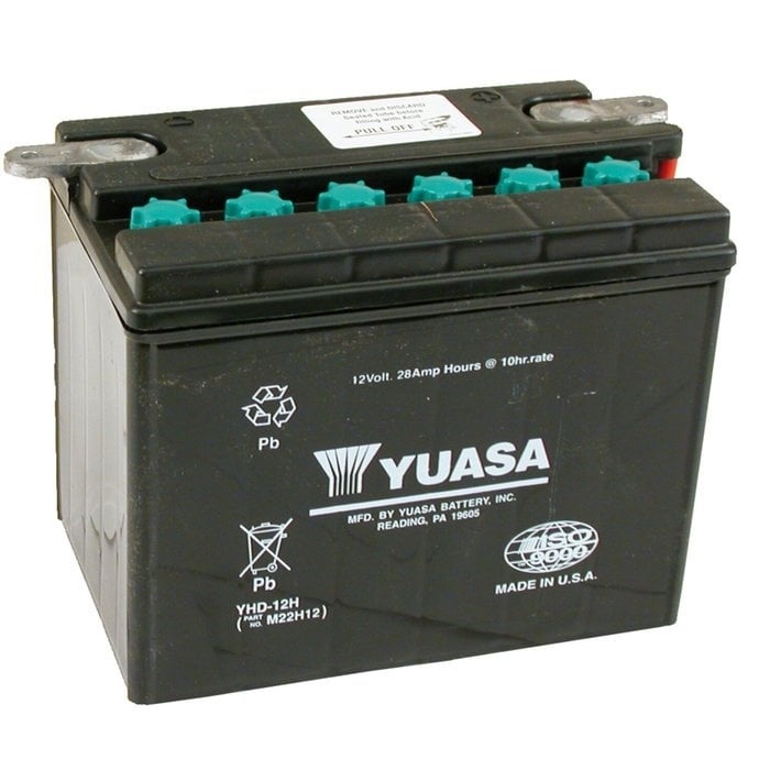Batterie conventionnelle 12 V YHD-12, 200 CCA (courant de démarrage à froid). Dimensions : 206 mm (longueur) x 133 mm (largeur) x 165 mm (hauteur). Poids avec acide : 8,3 kg. Volume d'acide : 2,2 litres. Charge : 2,8 A.