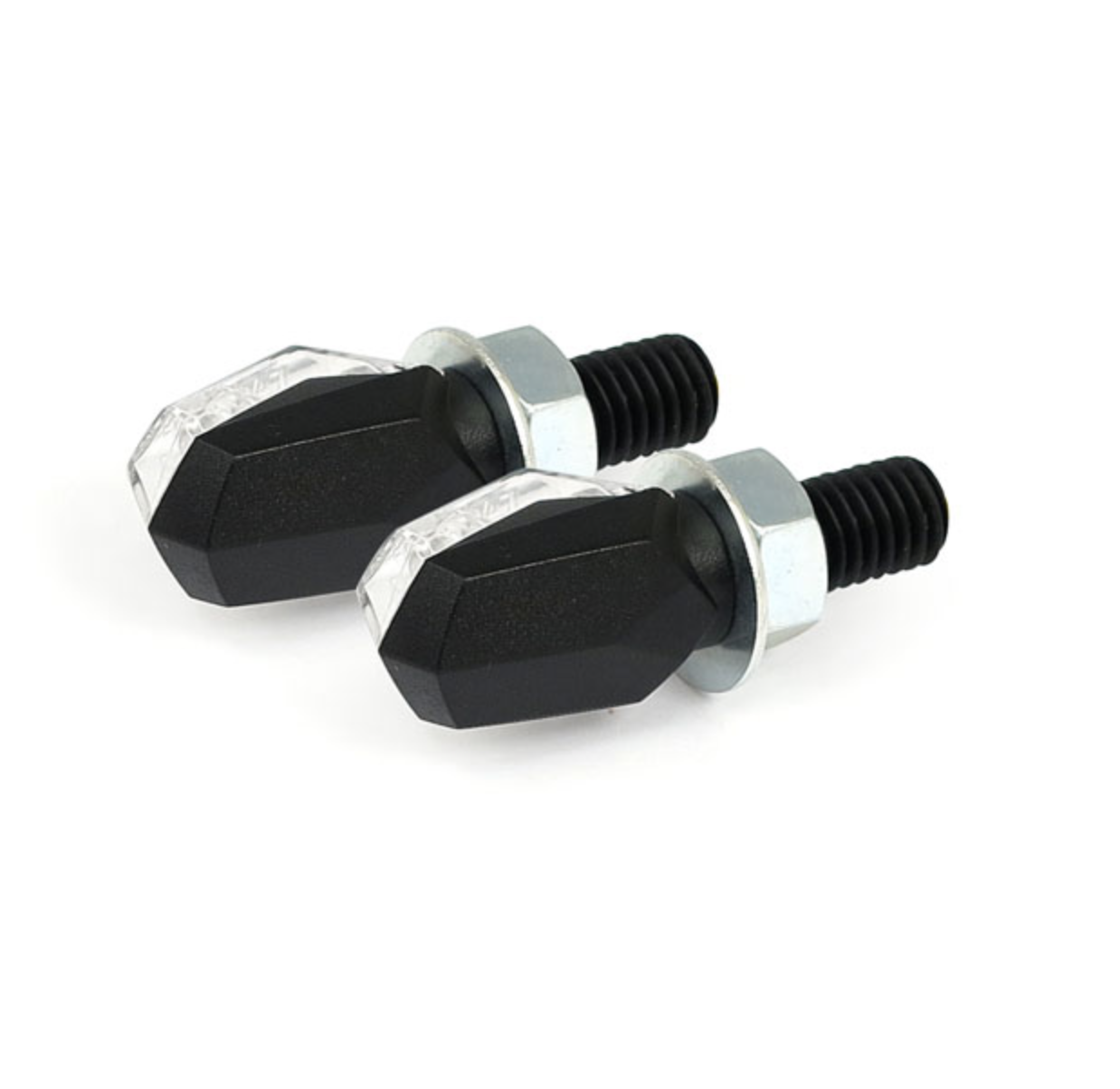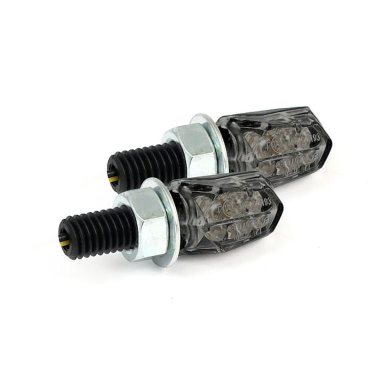 Petits clignotants à LED, noirs avec lentille fumée en plastique noir.
