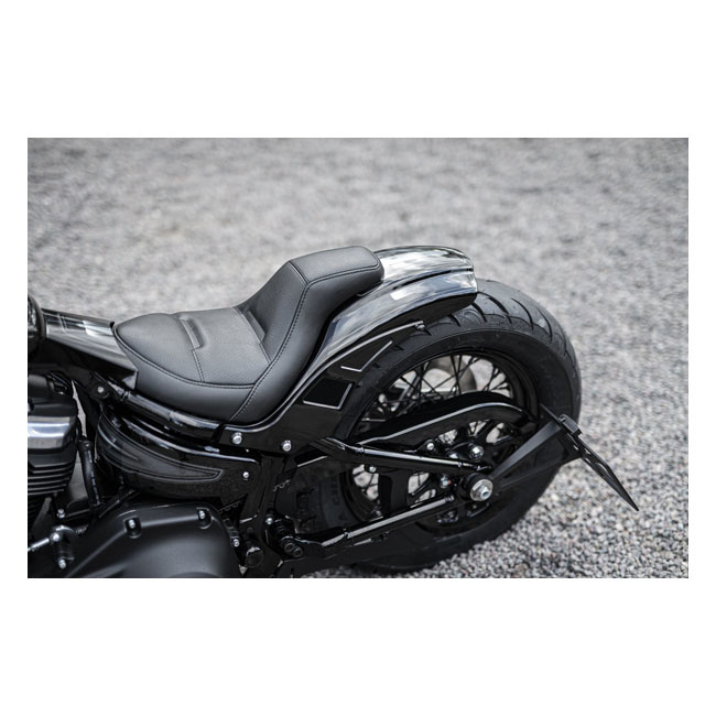 Zwart, synthetisch leer. Alleen gebruikt in combinatie met Killer Custom's 'Bobbstr' M8 Softail achterspatbordkits. Gemaakt met speciaal HR (High Resilient) schuim met een sterke kunstleren bekleding. Met de speciale 'Blocker' steek is deze stoel een lust voor het oog. Past op: > 18-20 M8 Softail met achterspatbord kit Bobbstr.