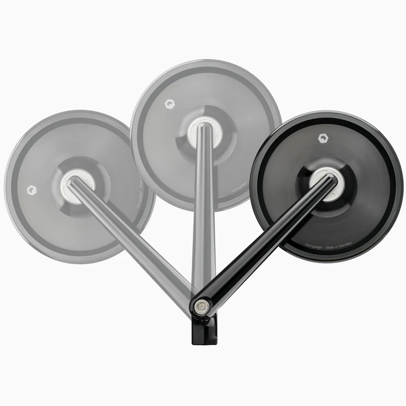 Uiterst praktisch bij smalle doorgangen, ruimtegebrek in de garage of bij transport. Het vergrendelingsmechanisme is zeer stabiel en kan niet per ongeluk worden versteld. De spiegel trilt niet, zelfs niet bij hoge snelheden, mits correct gemonteerd.