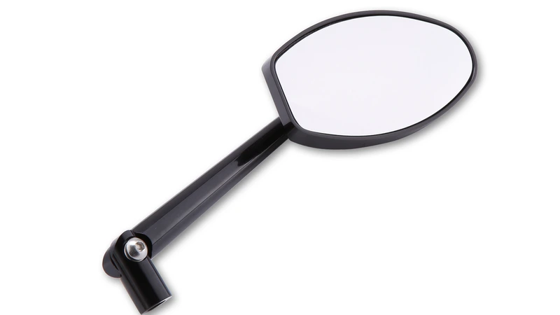 Zwart glanzend geanodiseerde stuurspiegel van aluminium. Fijne, gefreesde groeven op de ovale kop benadrukken de hoogwaardige afwerking en de fraaie uitstraling.